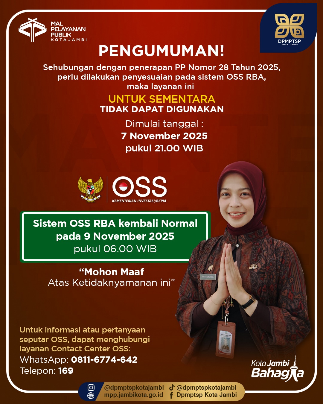 DPMPTSP Kota Jambi Umumkan Maintenance OSS RBA Selama Dua Hari